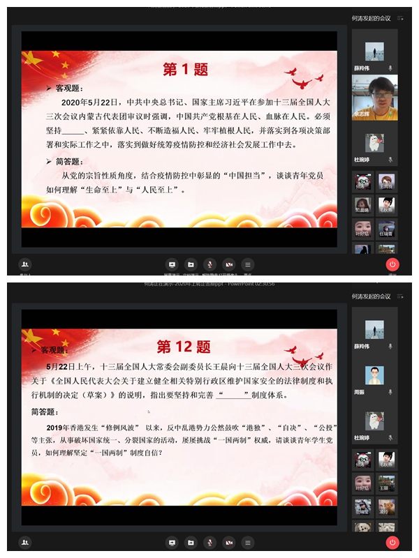 为进一步完善学生预备党员考察机制,促进学生党员学习两会精神,切实发挥学生党员先锋模范作用,环境与土木工程学院党委举行本学期预备党员转正答辩暨两会精神学习会。院党委副书记兼副院长金明媚,学工办主任蒋达锋,院党委秘书沈炎,辅导员周佳赟、薛羚伟担任答辩评委,本科生、研究生各支部党员参加会议。本次会议以线上形式开展,由辅导员何涛主持。