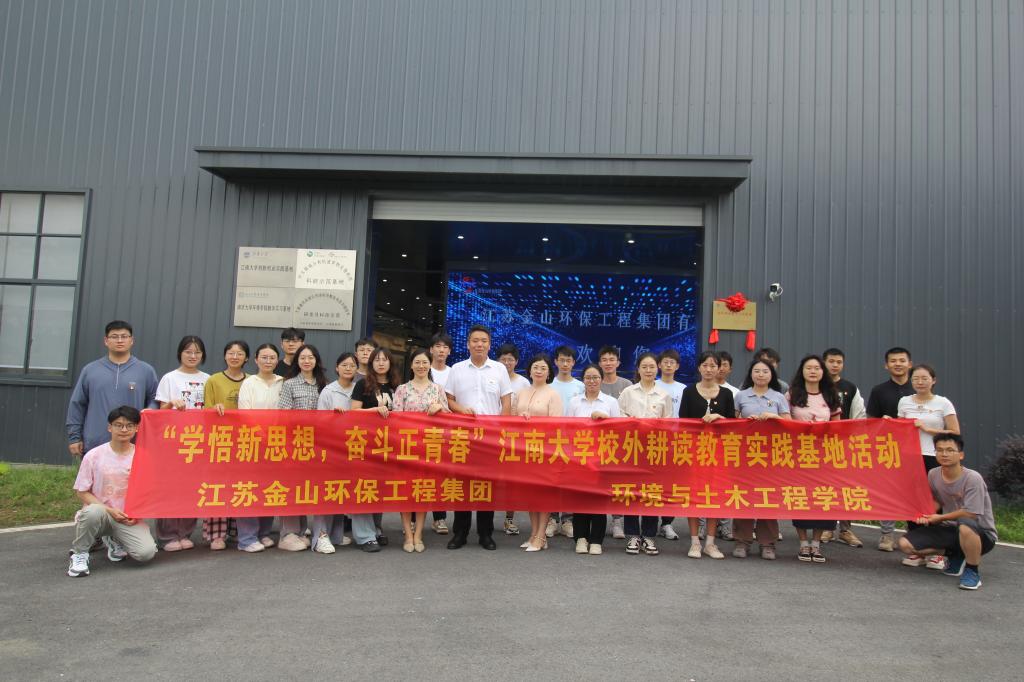 在江苏金山环保工程集团总裁兼党委副书记的陪同下,师生党员来到位于宜兴市竺山湖的环太湖城乡有机废弃物处理利用技术示范基地,参观科技治太展览馆和AIO蓝藻打捞平台,领略了如何将蓝藻变废为宝的科技魅力,近距离感受先进的生态治理技术。环境与土木工程学院党委副书记兼副院长胡娟和江苏金山环保工程集团总裁兼党委副书记徐韬共同为玩偶姐姐