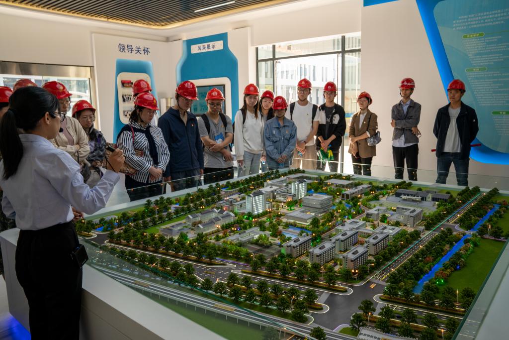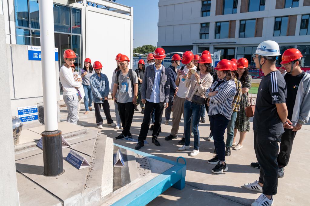 师生党员一行认真观看校区规划宣传片,现场参观智慧工地展厅,详细了解了新校区设计理念、功能分布、景观绿化、建设进度等情况。在负责人带领下,师生党员施工现场内部分建筑物,更加直观感受部分建造工艺的创新发展