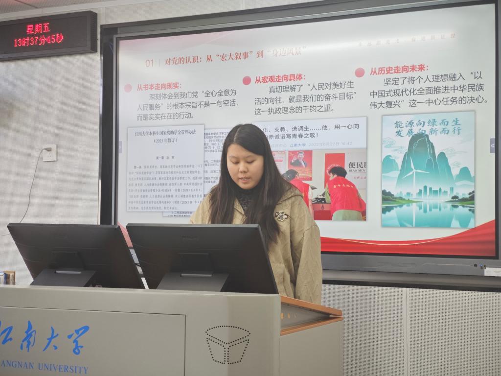 答辩分个人陈述、现场问答、现场评议三个环节。各拟转正预备党员逐一进行个人汇报,明确入党动机,从理论学习、组织生活参与、专业学习、社会实践等方面阐释先锋模范作用发挥成效,进行自我剖析,主动对标党员标准。每位拟转正党员进行抽题答辩,抽题答辩设客观题与主观题,涵盖党章党规、党的重要会议精神等核心内容。拟转正党员沉着应答展现扎实的理论功底,展现出良好的理论素养与风采,赢得了评委与参会人员的一致认可。最后,周期老师作总结发言,她表示,转正答辩是党员发展程序中必经的一环。在本次答辩中,她看到了大家在预备期一年内不断提高思想水平和理论素养,充分发挥了党员的先锋模范作用。