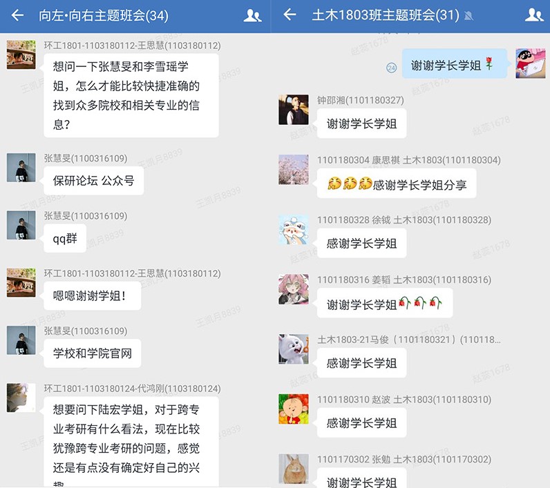 会议主要围绕欢送副班主任毕业,优秀学长学姐升学、就业经验分享交流和班主任总结三个方面展开。欢送副班主任毕业环节,同学们通过制作祝福视频等多样化的方式表达了对副班主任顺利毕业的祝福并真挚地感谢了副班两年来的照顾与支持。为帮助同学们进一步规划自己的未来,各班级邀请到王洪羽、张慧旻、姚明秀、姚刘达、王有成等10余位优秀学长学姐向同学们传授关于升学和就业的经验教训和实用干货,帮助同学们深入了解所学的专业,明确目标,合理规划,在接下来的大三生活和未来做出更好的选择。随后,他们针对同学们仍然疑惑和好奇的地方热心且认真地进行了解答。最后在班主任总结环节中,各班班主任老师结合自身经历,精细剖析了学长学姐的经验分享,希望同学们珍惜时光、找准自身定位、明确未来方向,并表达了对同学们的期望与祝福。