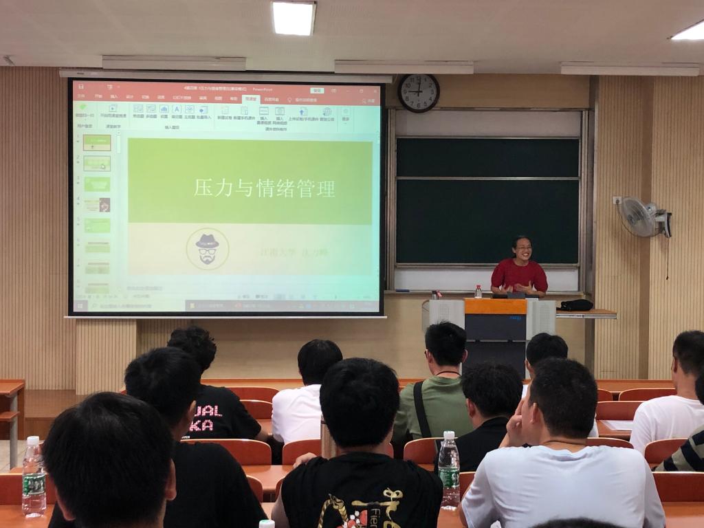 沈老师主要从压力篇、情绪篇、管理篇、心态篇四个方面展开讲述。讲座以互动提问的形式展开主题,沈老师邀请同学们分享了人生中最大的压力来源。根据同学们的回答,沈老师就压力的定义、分类、来源做了详细的介绍,提醒同学们要充分认识压力,学会权衡压力与行为绩效的关系,找到属于自己的压力调节方法。通过画“雨中的人”,模拟情景剧等形式,让同学们实际体验了如何合理地管理情绪、调节心态。沈老师的讲座灵动丰富、通俗易懂,同学们配合度高,课堂气氛活跃,讲座效果好。