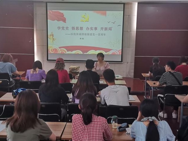 院党委副书记胡娟以“学党史 悟思想 办实事 开新局”为题讲授了党课。胡书记从学好党史具有重要的现实意义,学习党史要把握历史发展总脉络,中国共产党百年历程与启示以及如何树立正确的党史观四个方面展开讲述,寄语学生党员能够坚定理想信念,提高理论素养,勇担时代重任。