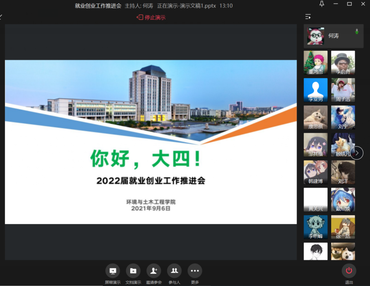 环境与土木工程学院利用线上平台召开2022届本科毕业生就业创业工作推进会,帮助同学们进一步认清当下就业形势,及早做好就业创业准备。本次会议由辅导员薛羚伟、何涛主讲,2018级全体本科生参与。