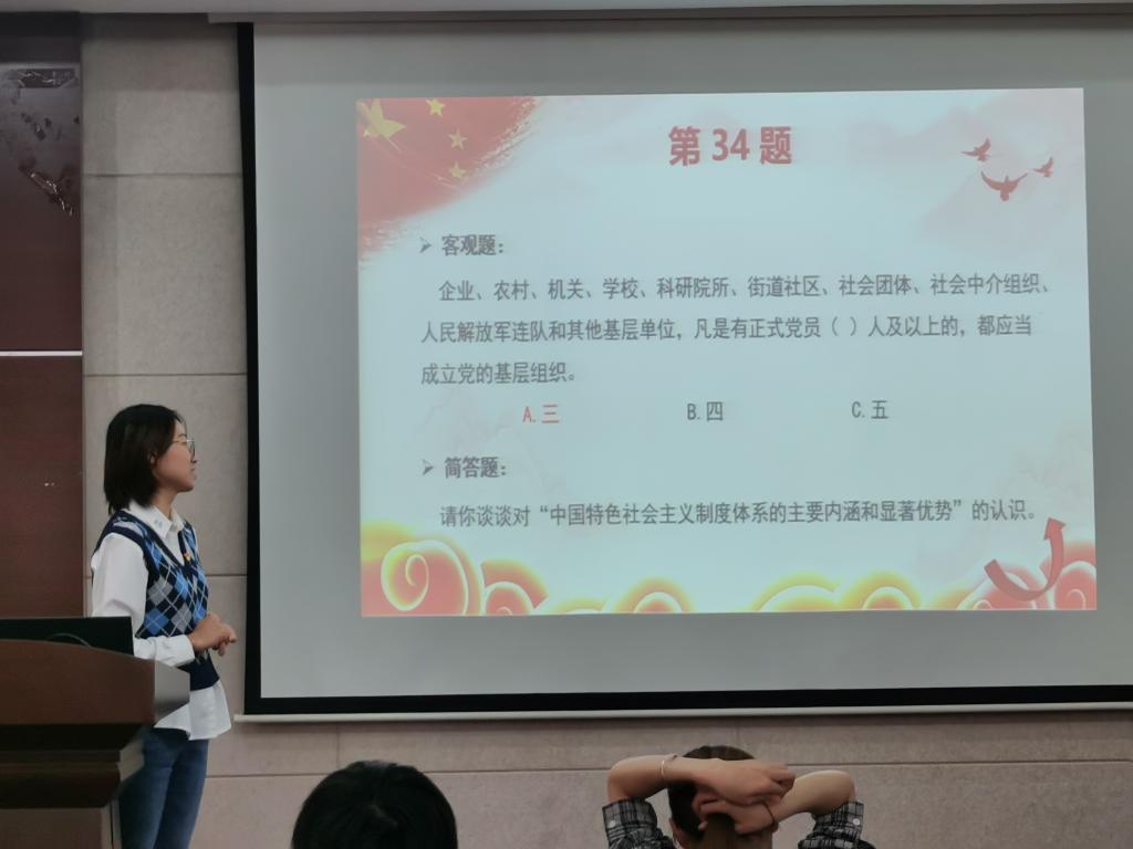 答辩分为个人陈述、现场问答、现场评议等三个环节。答辩会上,范凝慧等21名拟转正的预备党员分别以“我入党这一年”为主题,就自身在预备期间的思想政治、学习情况、工作表现进行汇报,对自身存在的不足进行剖析,并对不足之处提出改进计划。现场问答分为客观常识题和主观论述题。答辩评委就党的基本理论和知识、习近平新时代中国特色社会主义思想、时事政治以及答辩对象日常学习工作情况进行提问。答辩小组根据答辩对象的陈述和答辩情况,进行评价和打分,并反馈针对性意见,对部分学生的答辩内容进行了纠正和指导。