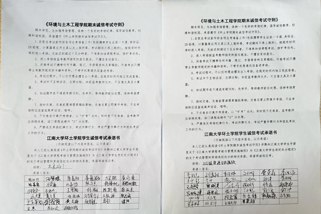 学生违纪处分规定(2017年修订)》等制度中关于诚信考试的规章制度,对学生进行基本的政策宣传和讲解,同时加强社会主义核心价值观教育,引导学生树立正确的世界观、人生观、价值观和成绩观,树立远大的理想和抱负,不为一时的利弊得失而丧失本心,做一个堂堂正正的江大环土人。