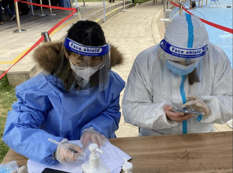 学子积极响应社区号召,战斗在疫情防控第一线。他们做好严格的消杀措施,戴好口罩和防护帽,穿上厚重的防护服,再戴上隔离面罩和两层手套,为前来核酸检测的居民,引导排队、扫码和信息采集,为疫情防护贡献自己的力量。