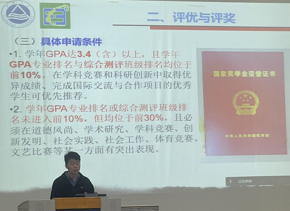 讲座伊始,李老师介绍了本科生综合测评、评奖评优过程中的评价细则,引导学生重视学业成绩,鼓励同学们积极参加社会实践、专业竞赛,提升自身综合素质。为了让家庭经济困难的学生安心完成学业,李老师详细说明了家庭困难学生的资助政策与申请方式。最后,李老师着重介绍了违纪处分规定及重要管理规定,强调同学们要注意日常行为规范,遵守校园管理制度,维护学校教学秩序。