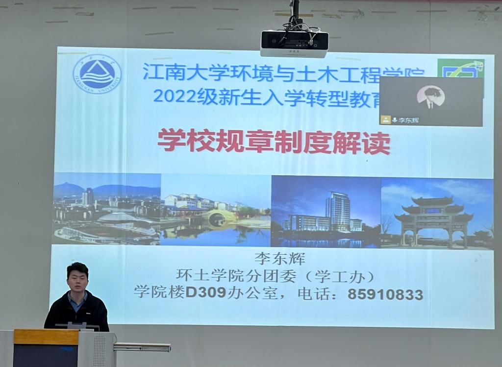 为深入开展新生转型教育工作,使新生尽早了解熟悉学校规章制度。2022年10月11日,环境与土木工程学院在1C109开展新生转型教育第二期讲座,辅导员李东辉为新生解读学校规章制度。