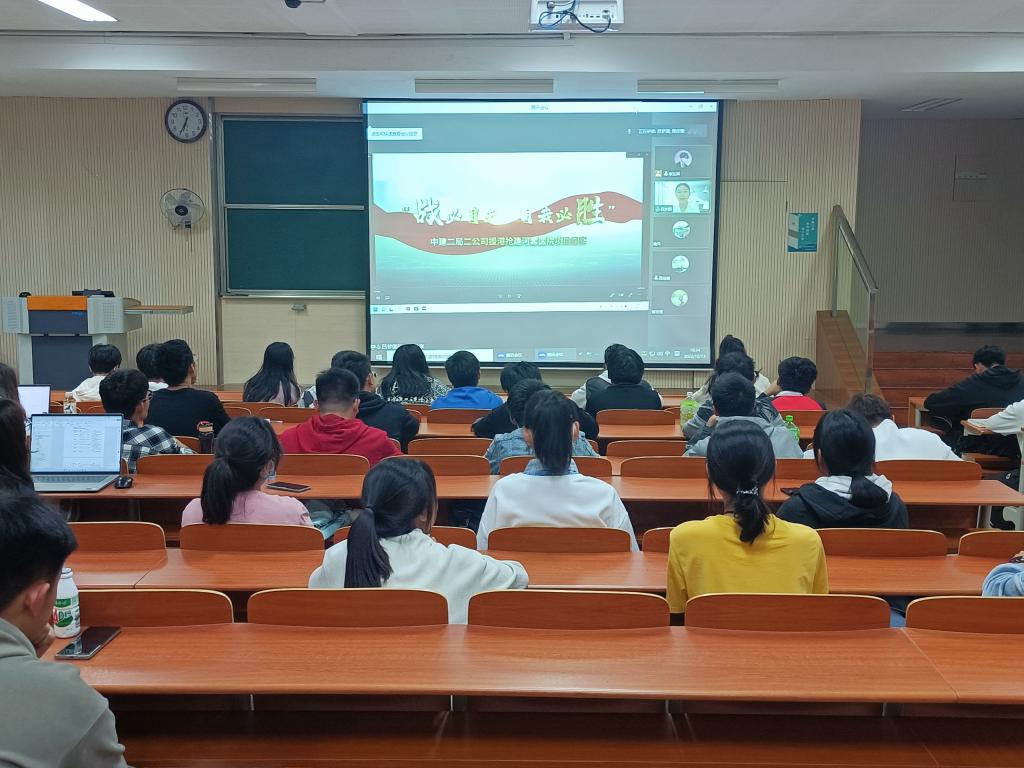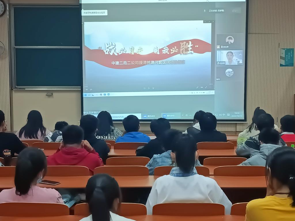 吕梦圆目前担任中建二局二公司团委书记兼技术中心经理助理,她从“终身学习、开拓创新、树立远大理想”三个方面与大家进行分享。通过讲述自己初入大学,继续深造以及就业之后的经历,告诉同学们应该如何转变心态来适应相对宽松自由的教学与学术环境,期望同学们保持“一物不知,深以为耻,便求知若渴”的心态,坚持终身学习,锤炼过硬本领。吕梦圆鼓励同学们要依托学校提供的广阔平台,积极参加学校组织的活动,实现自身全面发展。关于理想和未来,吕梦圆通过自己职业规划上的经历并结合当下的社会现状,还播放了自己援建香港方舱医院的记录视频,激励同学们要“永葆爱国之心,立存鸿鹄之志”,要树立主人翁意识,时刻将自己的命运和国家的命运结合起来,将自己所学转化为工程实践,实现自己的社会价值。