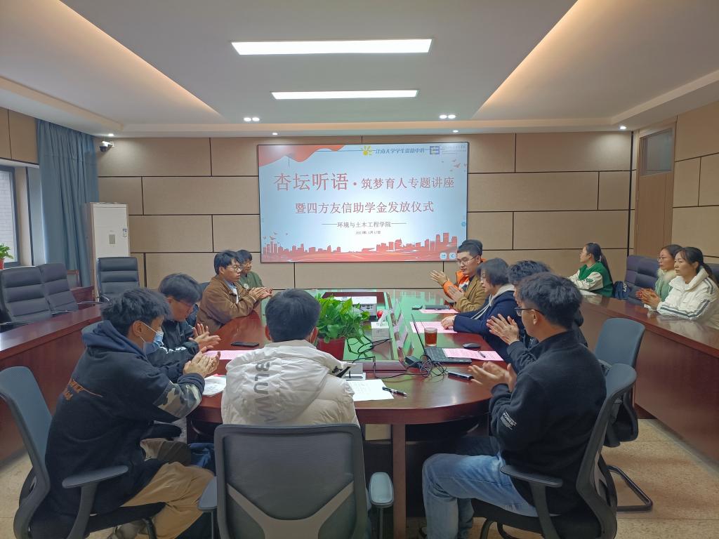 2023年3月17日下午,环境与土木工程学院在D305举行四方友信助学金发放仪式暨杏坛听语·筑梦育人专题讲座,环境与土木工程学院党委副书记、副院长胡娟,环境与土木工程学院分团委书记、学工办主任周佳赟,辅导员何涛、李东辉出席,部分四方友信助学金受助学生现场参会,会议由薛羚伟主持。