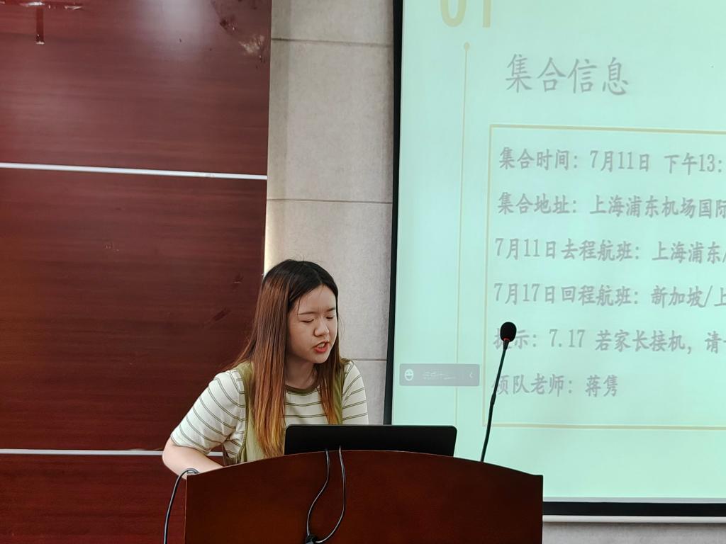 校际学生海外游学协议书》,并上交国交处。会上,李东辉要求学生明确海外游学的目的和意义,希望学生通过海外游学提高独立学习、生活、思考及团队协作等方面能力,增强对国家的认同感和自豪感,自觉维护祖国形象和安全。其次,李东辉就人身财产安全方面强调了在外的安全问题,任何事情应以安全为先,并随时与家长、学校老师和项目方老师保持联系,保障自身人身安全,在外遵守当地法律法规、尊重文化差异、安全问题、宗教问题。最后,从衣、食、住、行四个方面为同学们讲解了在新加坡游学期间需要注意的事项,并为同学们提供了许多实用的出行小贴士,叮嘱同学们珍惜此次赴新加坡学习和交流的机会,认真对待在新加坡学校的各项学习任务,主动学习,积极了解本专业前沿动态。在座全体同学悉心聆听,纷纷表示受益匪浅。