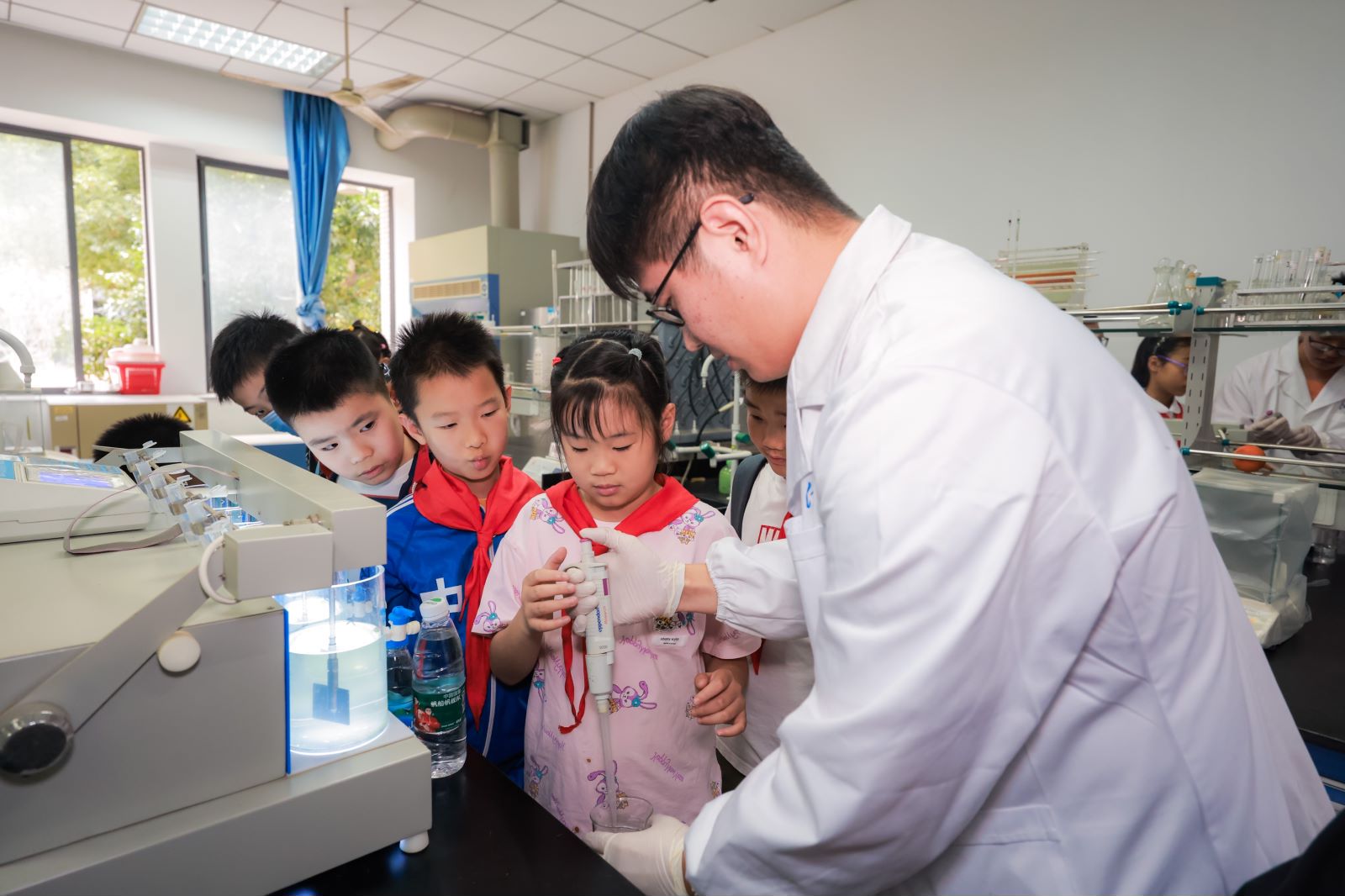 水是生命之源,也是生活的命脉。为提升小朋友们知水、用水和爱水的素养,环境与土木工程学院张周老师为前来参观的小朋友们安排了一次生动的科学小实验。在实验室中,张周老师首先为大家进行混凝实验相关介绍。混凝搅拌实验是一种模拟混合、反应、沉淀三个工艺过程的实验手段,小朋友们分为四组在实验员的指导下体验混凝试验的魅力,实验过程中学生们热情高涨,不仅了解了转化水质的重要过程,还获取了处理水与废水的重要方法。