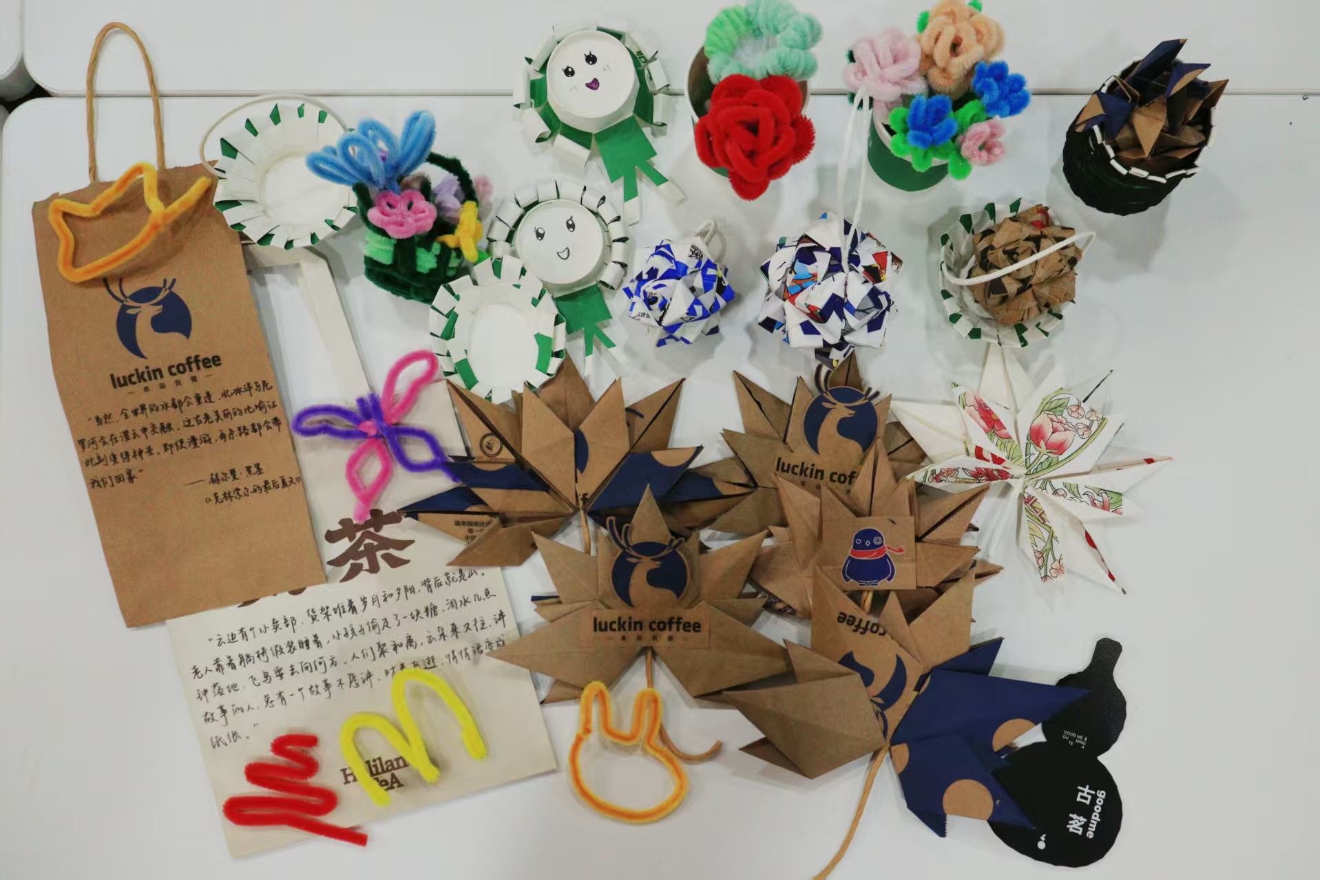 活动现场,参与者以纸杯、牛皮纸袋、扭扭棒、草稿纸等日常废弃物为原料,展开了别开生面的“变废为宝”创作。大家充分发挥创新思维,将一次性纸杯剪裁装饰为春日小花盆,把废旧牛皮纸袋改造为枫叶造型书签,用彩色扭扭棒编织出绿植茎叶,普通草稿纸经折叠拼贴化作精致绣球。在两个小时的实践过程中,青年学子相互交流制作技艺、分享环保心得,一件件兼具实用性与艺术性的手工艺品相继诞生,既展现了“化腐朽为神奇”的创意巧思,也成为“资源循环利用”理念的生动注脚,现场洋溢着劳动创造的热情与绿色生活的共识。