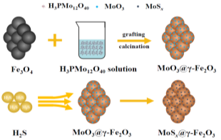 环境催化课题组通过磷钼酸嫁接对硫化磁赤铁矿进行改性:一方面通过调控磷钼酸与磁赤铁矿的界面效应抑制磁赤铁矿相变而提高其热稳定性,进而提高其磁性;另一方面通过控制磷钼酸嫁接磁赤铁矿表面的硫化效应而提高其表面活性硫物种的含量,进而提高其零价汞吸附能力。开发出了能协同湿式电除尘器回收燃煤烟气中零价汞的高效并可循环使用的MoSx@γ-Fe2O3磁性吸附剂,为推动我国燃煤电厂汞污染控制从形态调控向集中控制的转型升级提供了重要技术支撑。