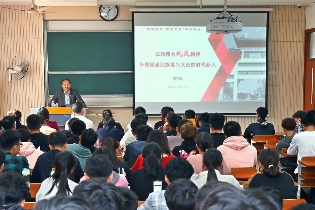 1116日下午,副校长顾正彪教授走进思想政治理论课课堂,以“弘扬伟大抗疫精神,争做堪当民族复兴大任的时代新人”为题,为环境与土木工程学院2020级土木工程专业学生讲授形势与政策课。院党委书记李艳,副书记胡娟,辅导员何涛和110余名学生参加学习。