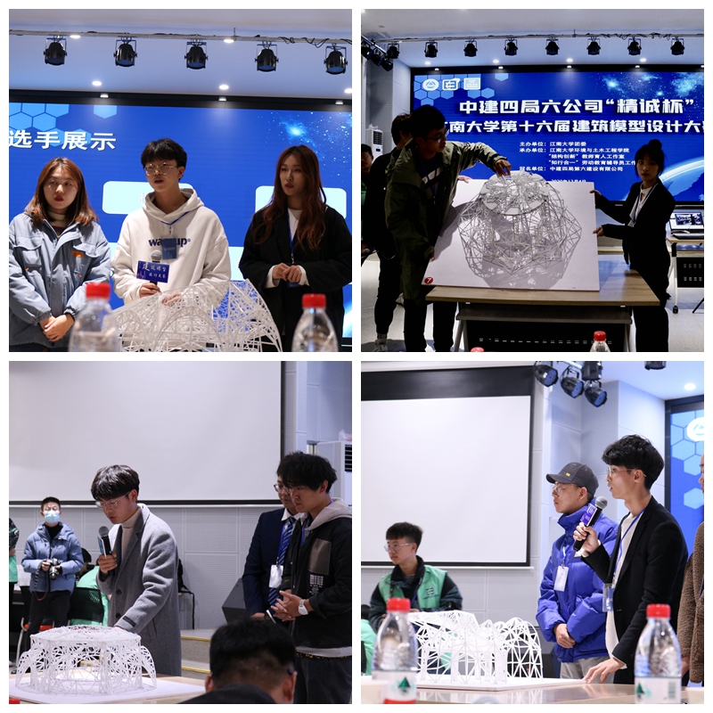 宋千军为大赛致辞,他指出建筑模型设计比赛是锻炼同学们实践创新能力的重要舞台,中建四局六公司期待与环境与土木工程学院加强产学研合作,共同助力人才培养。决赛采用团队展示与答辩相结合,每组团队进行3分钟模型构造设计展示,评委老师从结构设计、创意、美学、团队合作等方面提问,考察作品的创新性、专业性与设计感。获得往届特等奖的团队展示了优秀模型作品《蝉》并分享了经验。