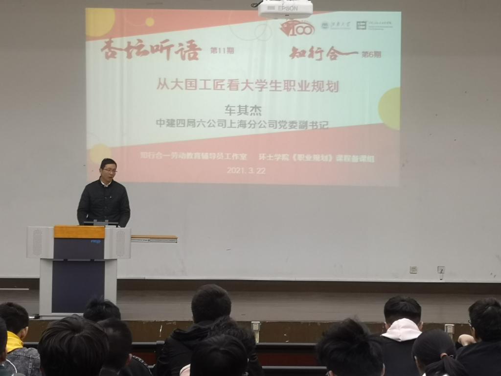 为了让同学们更好地了解今后职业走向,合理进行生涯规划,3月22日晚,环境与土木工程学院启动“致敬百年”系列讲座暨“杏坛听语”第11期、“知行合一”第6期在教学楼1C109举行。学院邀请中建四局六公司上海分公司党委副书记车其杰为同学们作讲座,辅导员薛羚伟、何涛出席,2020级全体新生参加了本次讲座。