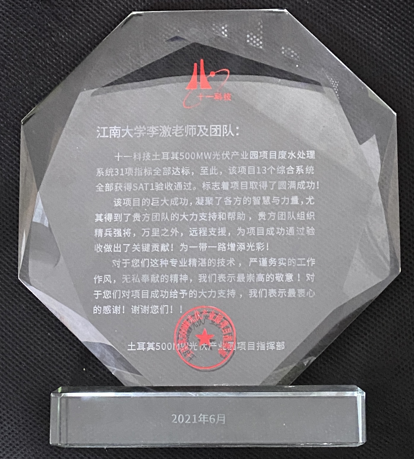 环境与土木工程学院李激教授,寻求技术支持。李激教授依靠丰富的工程经验,远程指导现场人员因地制宜地采取了有效的应急措施,并为实现后续长期稳定的出水达标提供了专业建议。通过双方的不懈努力,废水处理站的各项指标在项目截止日期前均达到了排放要求,成功签署了验收报告。十一所为表示感谢,特赠与“一带一路”项目水晶纪念牌。