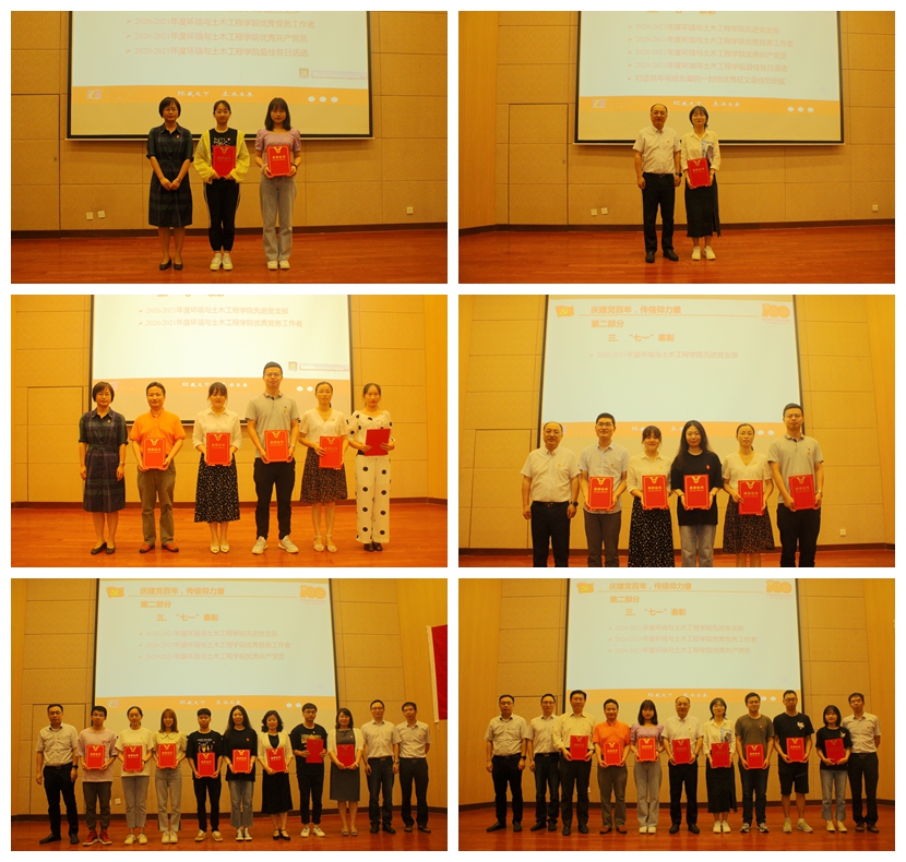 活动在《奋斗百年路 启航新征程》的铿锵诵读声中开始。由各支部党员代表组成的朗诵小组,声情并茂,带着全体与会党员,从红船出发,开启新时代的向往,加冕祖国建设的荣耀,感受着党一路带领人民创新突破,建功立业。随后在院长王震宇同志的带领下进行了新党员入党宣誓、党员重温入党誓词仪式。新党员代表2019级环境科学硕士研究生唐洁雨、毕业生党员代表林欣怡同志先后发言。她们表示将从党的百年奋斗中汲取前行力量,以昂扬奋斗姿态,在今后的学习工作中、在平凡的岗位上发光发热。院党委书记李艳同志宣读了2020-2021年度学院优秀共产党员、优秀党务工作者和先进党支部的表彰决定。院领导为16位优秀党员、5位先进党务工作者和5个先进支部颁发了荣誉证书。同时,对最佳党日活动申报支部和“对话百年,写给先辈的一封信”征文活动优秀组织支部进行了奖励。最后,院分工会合唱团深情演唱了《我和我的祖国》,把最美的祝福送给党,把深深的感恩献给祖国。