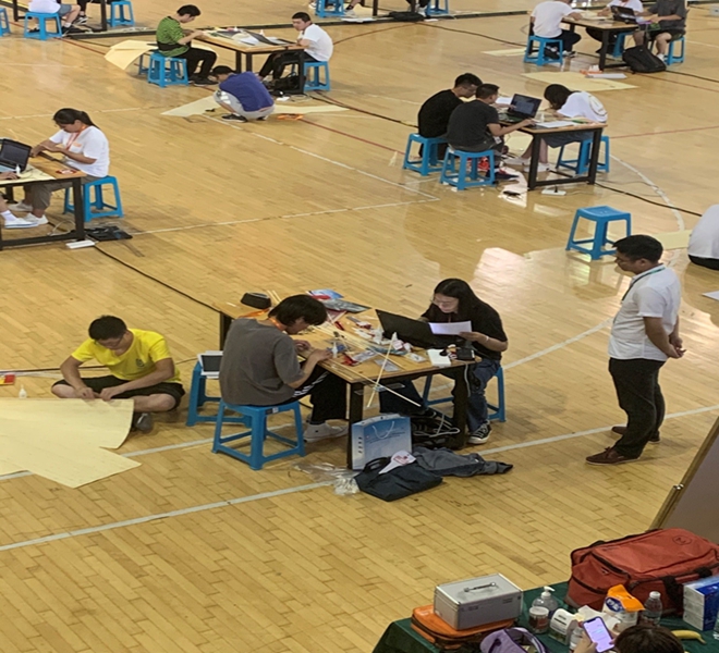 学生柴纪龙、邱叶凡和黄诗怡完成的作品“煋”以全场最高分获得特等奖;张志强、黄子叶和饶文威完成的作品“空”获得一等奖。在模型加载单元,根据现场抽取的荷载工况,王姝涵、陈孙龙和姜韬三位同学在16个小时内完成了对桥梁结构的设计与制作,并顺利通过全部三级荷载,最终获得二等奖。