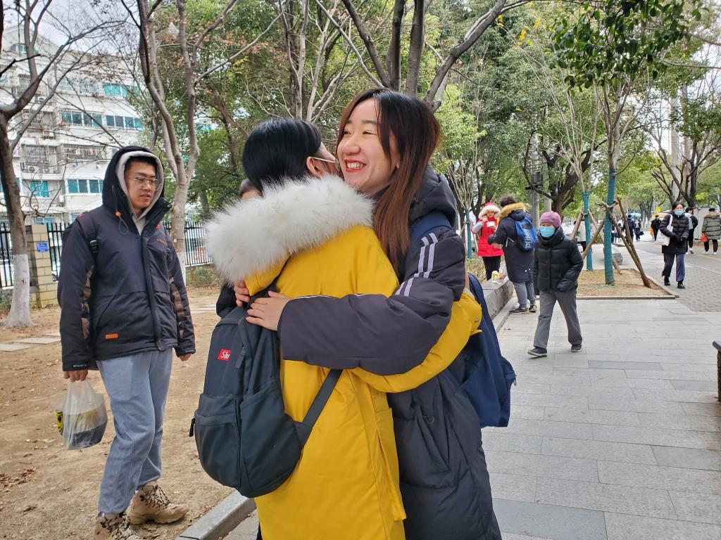“相信自己,加油!”“别担心,抱一抱,我们始终与你温暖相随。”在学院学生各考点前,党员志愿者们举起加油板,给予拥抱,为进场的考生们加油助威。学院党委在学院学生参加考试的玩偶姐姐