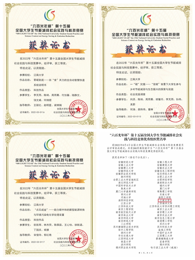由环境与土木工程学院何涛、薛羚伟老师、设计学院章琳老师指导,向贤、陈琦、周雨菁等同学完成的作品《一“碳”究竟——“双碳”背景下大学生参与乡村节能减排与生态振兴的探索与实践》荣获三等奖。作为社会实践调研报告类参赛作品,该作品介绍了团队成员奔赴安徽六安徐郢村、贵州上歹村、江苏无锡零碳科技产业园、安徽阜南现代循环农业产业园等多地深入调研学习,发现生态与减排问题,开展双碳环保科普宜传,加强乡村节能减排宣传与生态振兴的路径,探寻节能减排示范案例与先进技术,探索大学生参与乡村节能减排与生态振兴的有效举措等一系列实践成果,助力“节能减排”的成功实现。