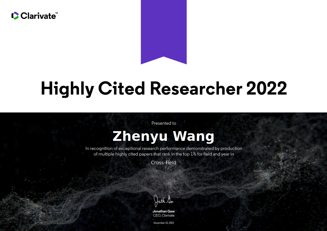 王震宇教授继2019、2020、2021年入选科睿唯安“高被引科学家”名录之后,再次荣登交叉学科领域榜单。