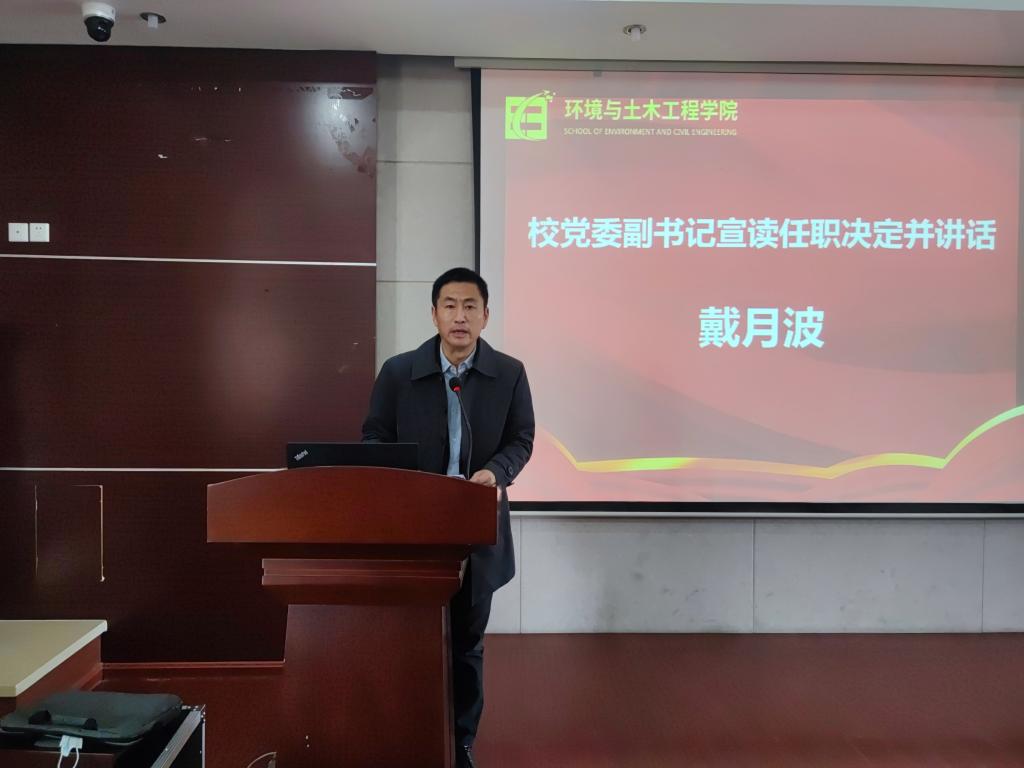 3月8日上午,环境与土木工程学院党政正职任职宣布大会在学院D303会议室举行,校党委常委、副书记戴月波出席,环土学院全体教职工参加会议。会议由学院党委副书记兼副院长胡娟主持。