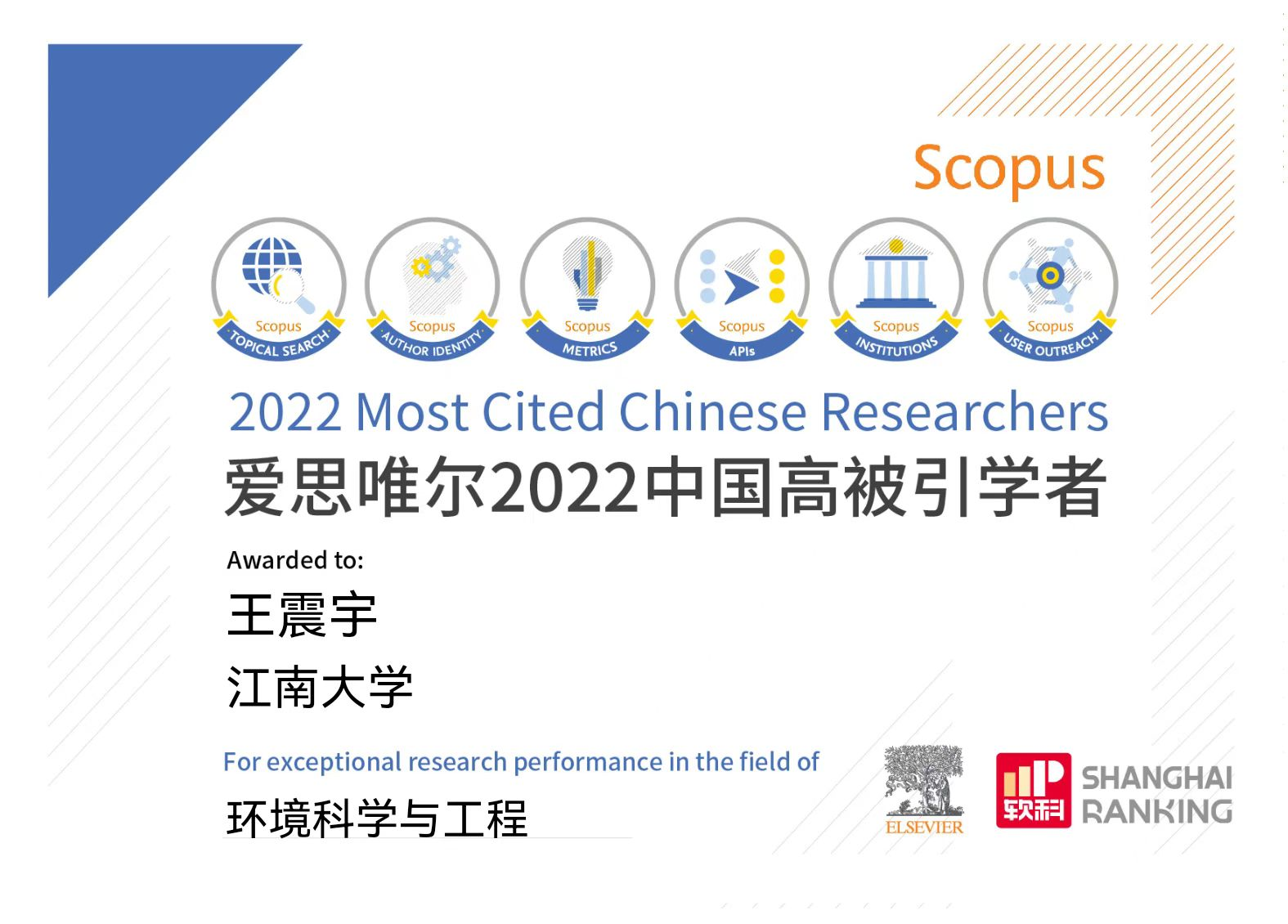 2023年3月28日,爱思唯尔(Elsevier)正式发布2022“中国高被引学者”(Chinese Most Cited Researchers)榜单,本次共有5216位学者入选。其中环境科学与工程领域136人入选。玩偶姐姐