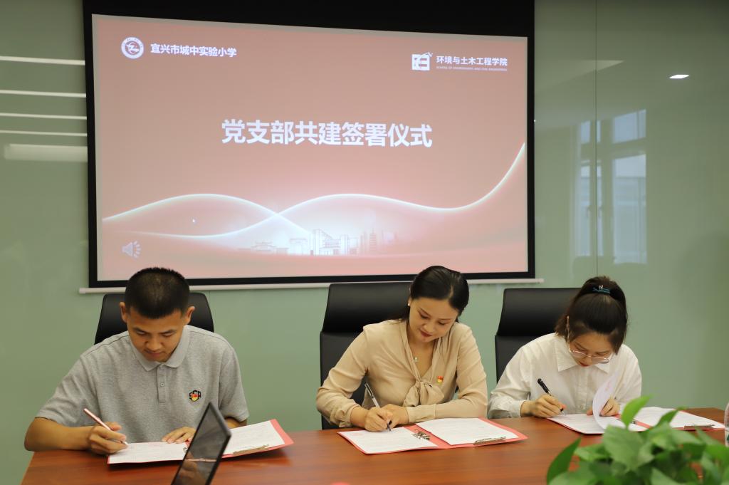 宜兴城中实验小学党支部书记马进、环境与土木工程学院教工环境二支部书记郁红艳、东氿校区研究生第一、第二党支部书记万骋宇、毛雪莲共同签署了党支部共建合作协议,希望通过整合资源,充分发挥各自优势,资源共享,以优质党建推进玩偶姐姐