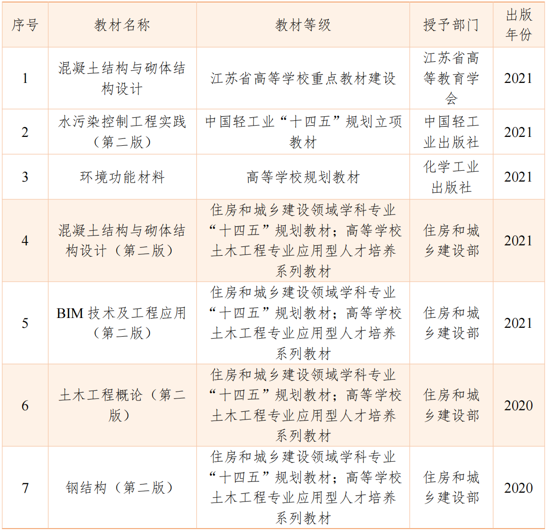教学成果二等奖。“结构创新”教师育人工作室获批校级课程思政先进教学团队,“环境工程系”和“结构力学课程群教研团队”获批校级基层教学组织建设点。大别山扶贫实践团队获评全国“千校千项”最具影响力好项目、“E路黔行”生态脱贫实践团队获评省级优秀团队。