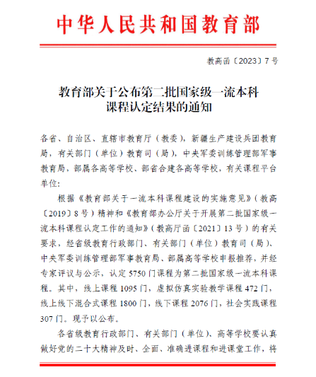 一流本科课程建设是贯彻落实全国教育大会精神和新时代全国高等学校本科教育工作会议精神,深化高等教育教学改革,推进建设高质量本科教育的重要举措。学院高度重视优质课程资源建设,积极推进教学改革和课程建设,实施了一流本科课程培育计划。以本次获批国家级一流本科课程认定为契机,学院将持续加大政策保障和经费支持,进一步引导专业教师持续投身教学改革和课程建设,全面提升课程建设水平和人才培养质量。