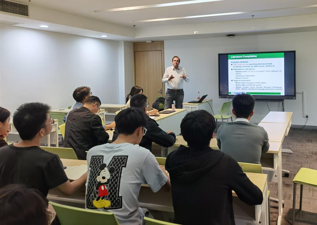 Tim aus der Beek博士以《Pharmaceuticals in the environment-The global perspective》为题,从全球视角系统阐述了药物活性化合物环境污染的研究现状,随后生动地介绍了在印度、德国等国家开展的药物活性污染物调研情况,最后详细剖析了药物活性污染物调研、检测过程中遇到的挑战及取得的效果和启示。报告期间,在场师生与Tim aus der Beek博士围绕新污染物的检测方法、环境标准和处理技术进行了深入交流,为未来双方合作开展科学研究、技术转化、人才培养奠定了基础。