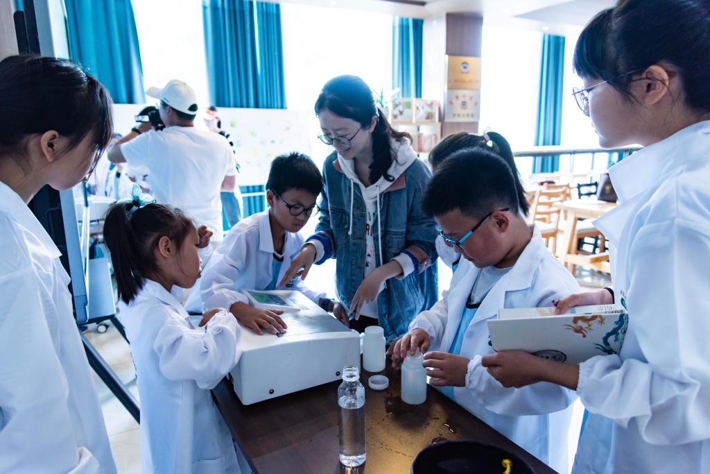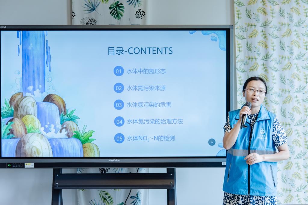 首先郁红艳老师从水体氮的种类和来源、水体氮污染和治理方法、水体中硝态氮及其含量测定方法四个方面为小学生们进行了保护水资源的科普讲解,让同学们深刻认识到水体氮污染的危害,从而认识到保护水资源的重要性。科普结束后,郁老师还详细讲解了不同水样的硝态氮含量检测实验过程,随后同学们分为三队由志愿者引导进行实地水样采集和水样中硝态氮含量的测定。郁老师和志愿者们协助小学生们利用紫外可见分光光度计测定了3个不同取样点水样的硝态氮含量,从方法原理、仪器步骤到数据记录,每一步实验步骤的参与让同学们充分体验到了硝态氮的测定工作。同学们兴趣勃勃,每个人都积极操作感受,并向志愿者提出问题,志愿者们也进行了耐心解答,现场氛围十分活跃。科普和实验过程中同学们都积极参与互动,展示了活力、热情和对知识的渴望。