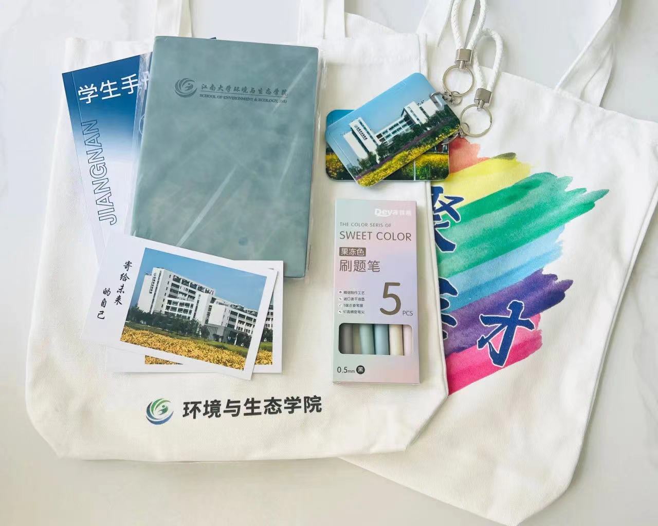 以心迎新,满怀心意。学院为每位新同学准备了开学大礼包——专属定制环保包、定制卡套、定制笔记本、定制签字笔、定制明信片,让学生感受到家的温暖的同时也能带着它们跨越今后的每一个挑战。