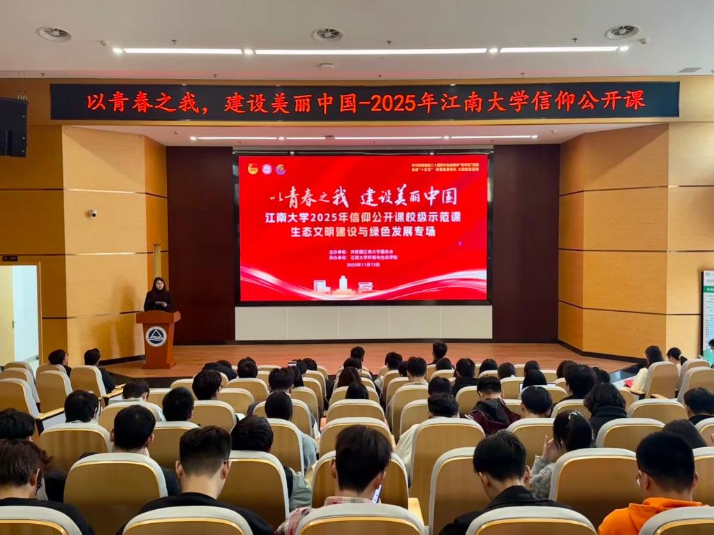 11月13日下午,“以青春之我建设美丽中国”信仰公开课校级示范课——生态文明建设与绿色发展专场在东氿校区钱盘生楼A101报告厅举办。本次活动同步开展学习贯彻党的二十届四中全会精神“青年说”、奋进“十五五”・青春挺膺担当主题团日活动,玩偶姐姐