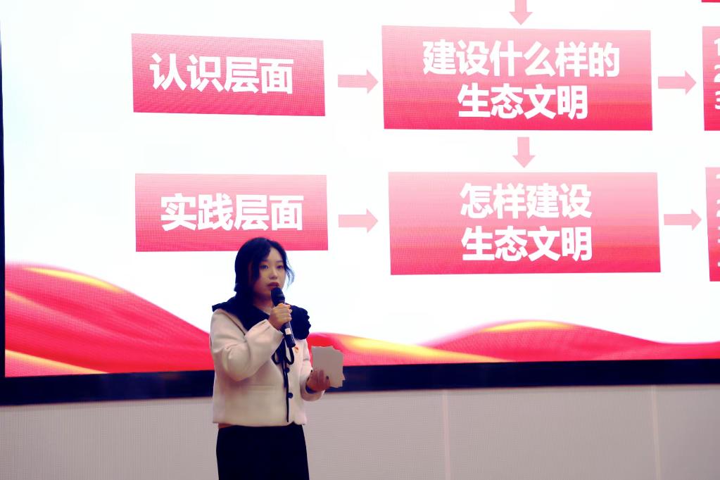 团委副书记、2023级硕士研究生沈凯分享了“绿碳方舟”生态科普志愿服务项目经验,通过“中小学环保课堂”“社区垃圾分类督导”等鲜活案例,展现了青年学子用脚步传播绿色理念的担当。马鼋学会青年理论宣讲员、马克思主义学院2025级硕士研究生潘美琪以《深学笃行生态文明思想,挺膺担当建设美丽中国》为题,阐释了“绿水青山就是金山银山”理念的实践伟力,引导同学们将个人发展融入生态强国建设大局。