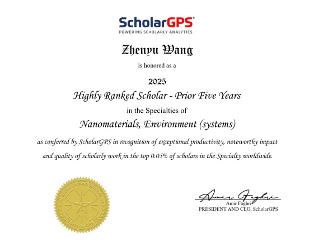 ScholarGPS“全球前0.05%顶尖科学家”荣誉证书
