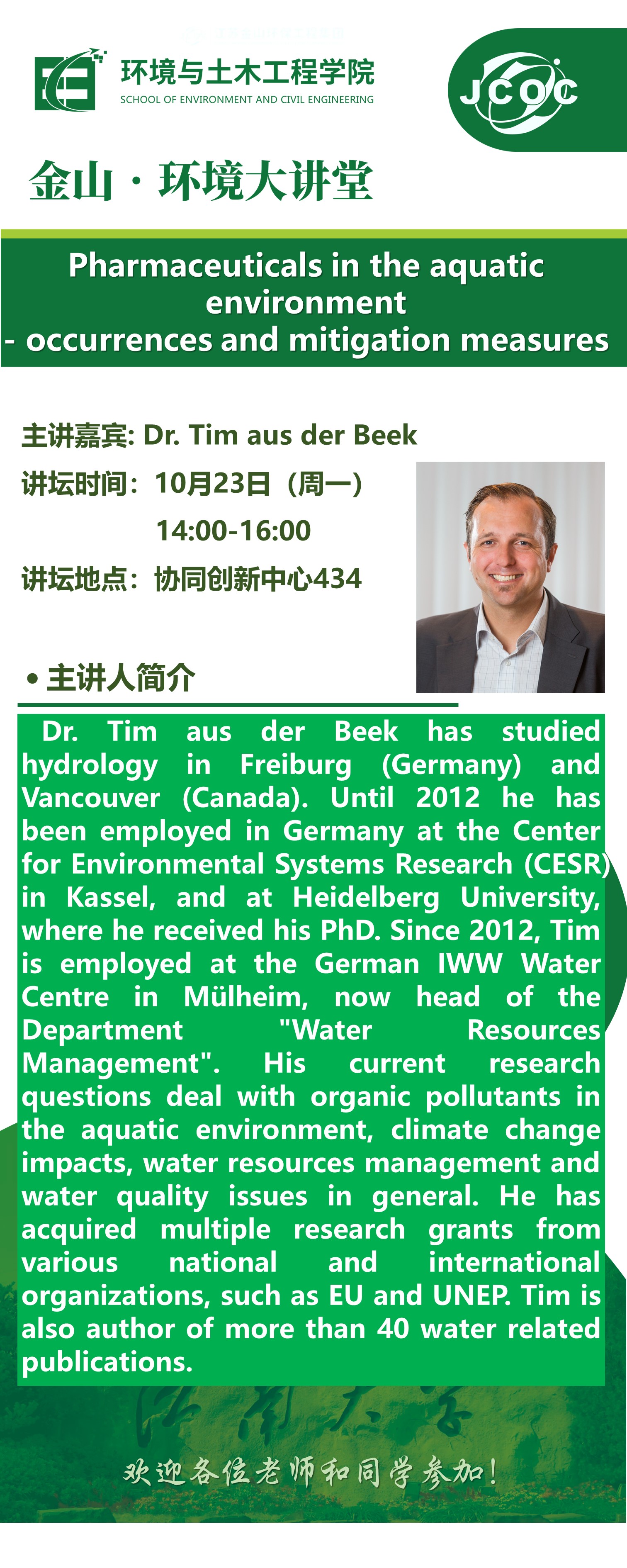 金山·环境大讲堂--Dr. Tim aus der Beek:Pharmaceuticals in the aquatic environment occurrences and mitigation measures