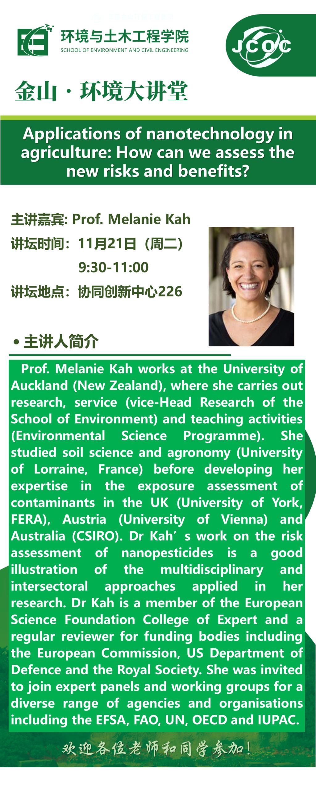金山·环境大讲堂——Melanie Kah:Applications of nanotechnology in agriculture: How can we assess the new risks and benefits