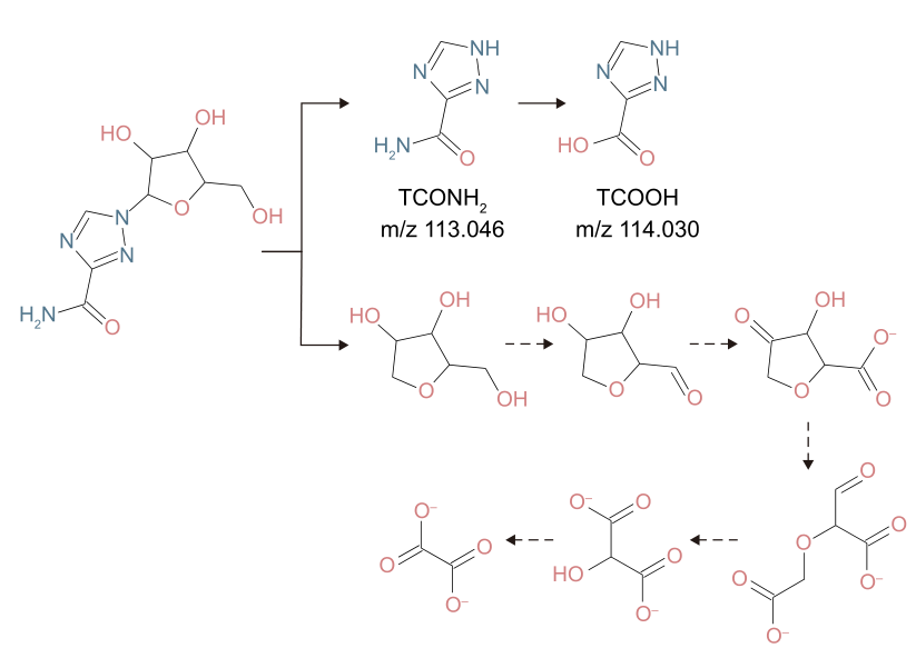 RBV可能的生物降解途径(虚线箭头表示不确定的途径)