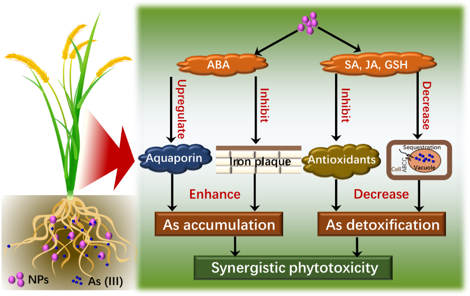 纳米塑料污染已引起全球的普遍关注。这些颗粒态污染物进入到环境中,因其具有高比表面积等特性,不可避免的与环境中已存在的其他污染物相互作用,进而对生物体产生联合毒性。本研究探究了环境相关浓度下,纳米塑料与水稻田中常见传统污染物-砷对水稻的联合毒性机制。结果表明,环境相关浓度下,纳米塑料对水稻生长未产生显著影响。然而,纳米塑料的存在,明显增加了砷对水稻的毒性效应。其主要机制为(1)纳米塑料抑制了水稻体内脱落酸合成和根表铁膜的形成,增加了水稻对砷的累积;(2)纳米塑料扰乱了水稻体内激素和谷胱甘肽的代谢过程,进而促进了水稻体内砷的氧化和向上转运;(3)纳米塑料抑制了水稻砷的抗氧化酶系统、砷的液泡隔离、砷外排等解毒途径。此外,本研究通过分根实验,率先证实了“特洛伊木马效应”不是纳米塑料提升水稻砷累积的主要机制。这些研究结果为客观评价纳米塑料环境风险提高了重要的理论依据。