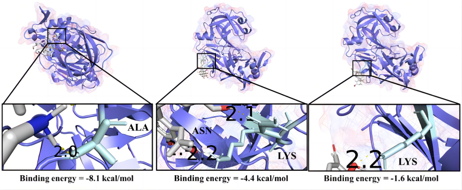 胃蛋白酶与CDs-NH2, CDs-OH, CDs-COOH的分子对接模型示意图