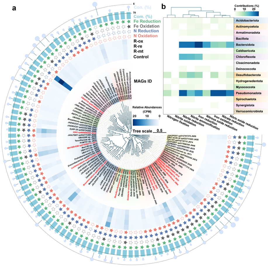 Fig. 3. Phylogenetic tree of MAGs (a) and phylum-level contributions to Fe and N metabolism (b).