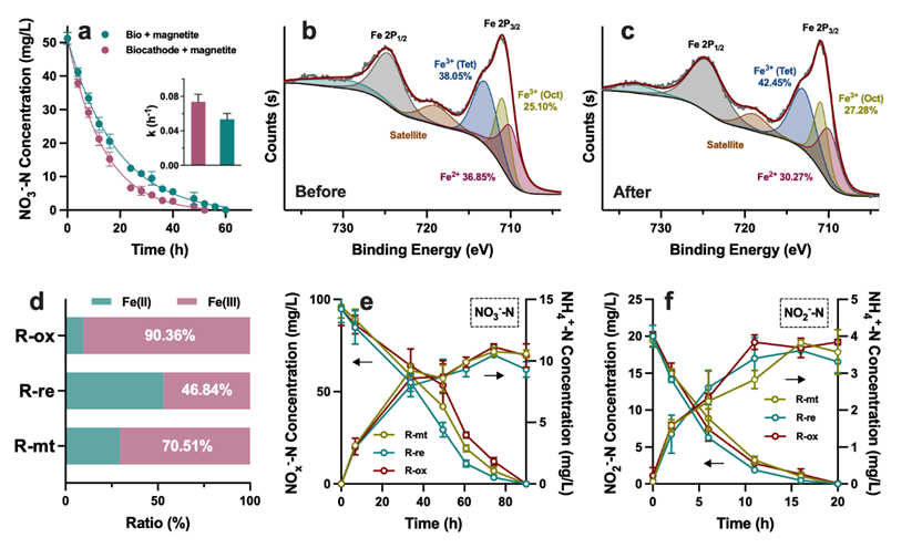 图2b-c:确定了投加位置为电极后,将反应前后的磁铁矿进行XPS测试,观察表面Fe(II)和Fe(III)组成,发现反应后Fe(III)占比上升,表明磁铁矿本体对脱氮效果的影响可能来自于表面Fe(II)/Fe(III)