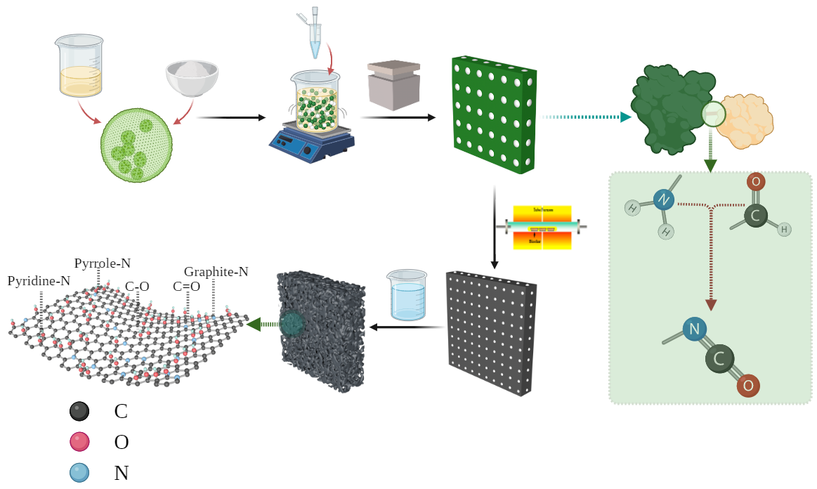 为解决这一问题,本研究采用酚醛树脂交联和碳酸钙模板改性技术(图1),将富含氮、氧元素的废弃蓝藻生物质升级为具备发达孔隙结构和优异电催化性能的三维多孔电极材料(图2)。这一新型三维多孔蓝藻电极(PAE)具备改良的氮掺杂结构、丰富的含氧官能团以及平均孔径约为70微米的大孔结构,显著提升了电极的微生物负载能力和电催化活性。