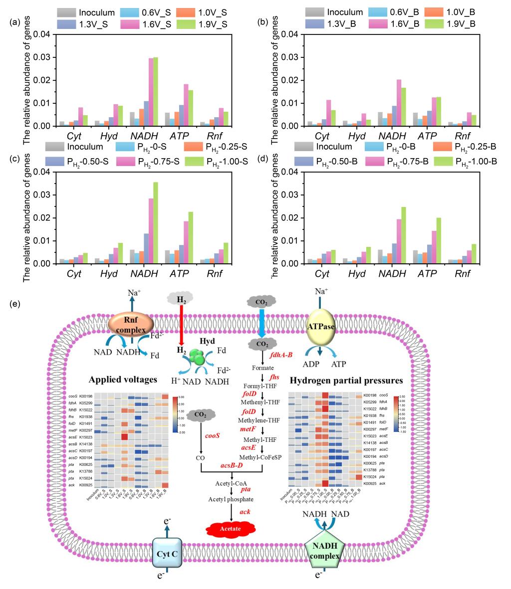 基于上述研究结果,考虑到电极电子和H2是MES系统中两种主要的电子形式,因此课题组开发了外加电压和氢分压两种调控措施,分别重点调控悬浮液和生物膜的电合成微生物群落,并解析了两种电子供给模式对乙酸合成的调控机制。结果表明,适当的外加电压(1.6V)可直接调控阴极生物膜微生物,促进了生物膜中同型产乙酸菌的快速富集和生物阴极的电化学性能。氢分压主要调控阴极室内悬浮液中微生物群落,显著提升了悬浮液中同型产乙酸菌的丰度,在PH2-1.00条件下时表现出最好的乙酸合成性能(1117.63 mg/L)和库伦效率(71.06%)。同时,两种电子供给模式均降低了乙酸降解菌unclassified_f_Rhodocyclaceae的相对丰度,促进了与乙酸合成相关的基因相对丰度的提升(图3),表明两种电子供应模式不仅抑制了乙酸的降解,同时还进一步促进了乙酸的合成。