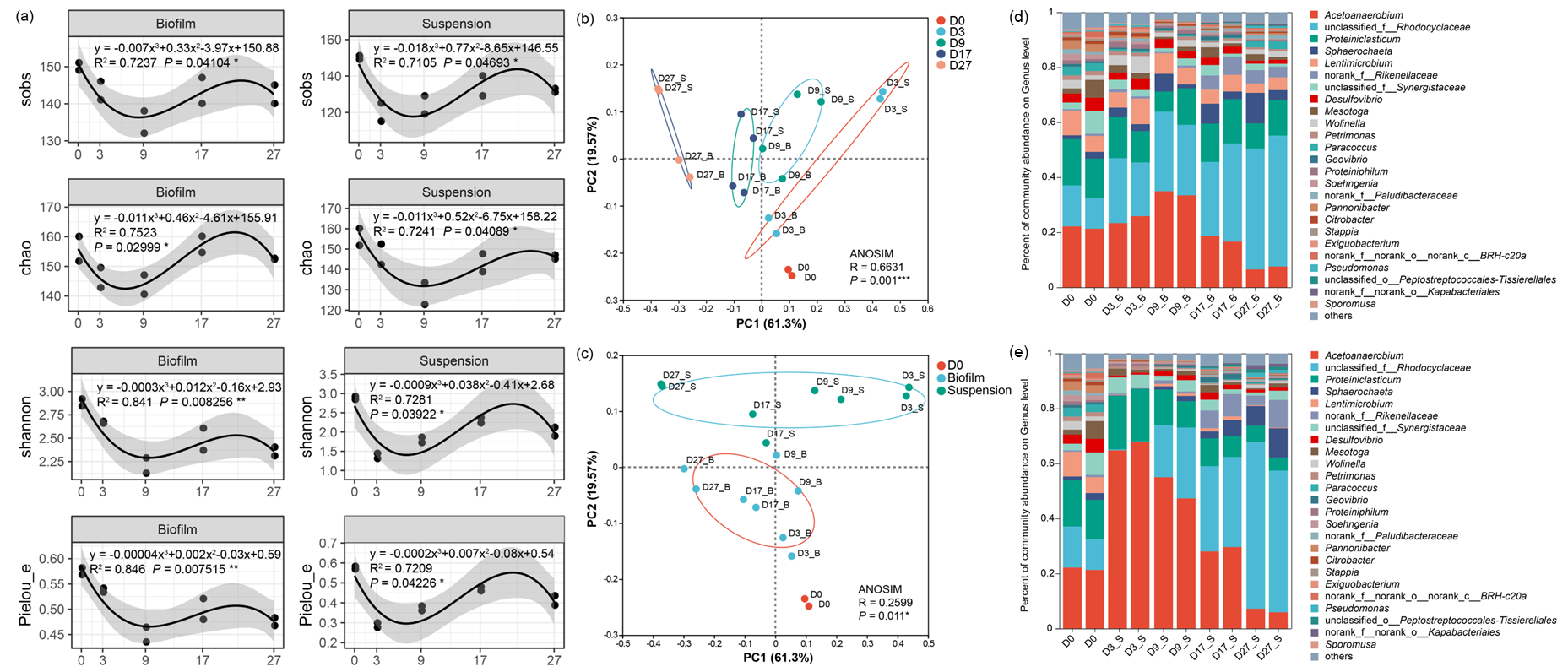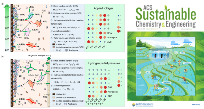 针对以上问题,刘和教授团队近期相继在ACS ES&T Engineering(2025,10.1021/acsestengg.4c00881)和ACS Sustainable Chemistry & Engineering(2025年,13卷11期)期刊发表了题为“Accumulated acetate serves as a driving force for the succession of heterotrophic microbiome and acetate degradation in microbial electrosynthesis system”和“Regulatory mechanisms of electron supply modes for acetate production in microbial electrosynthesis system”的研究成果。