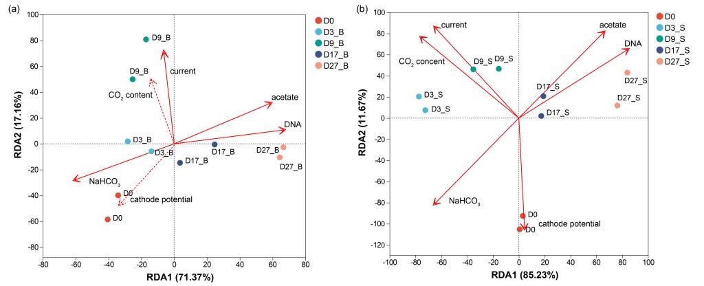 课题组构建了基于混合微生物菌群实现CO2转化的MES体系,首先探讨了MES系统造成产物乙酸降解的原因并利用DNA-SIP技术识别混合菌群中导致乙酸降解的微生物群类群和演替机制。结果表明,MES系统中乙酸产物的逐渐累积驱动了混合微生物的群落演替,主要存在于阴极室悬浮液中降解乙酸的异养微生物菌群逐渐增长,导致MES逐步由乙酸合成转向乙酸降解(图1)。进一步,通过DNA-SIP耦合宏基因组分析识别出这些降解乙酸的优势物种属于Rhodocyclaceae,包括Azonexus_hydrophilus、Azonexus_fungiphilus等。微生物群落的相关性分析结构表明,电流(电子供给)显著影响了生物膜和悬浮液的微生物群落结构,因此,MES系统中的电子供给可能是潜在的调控MES系统乙酸合成的关键手段(图2)。